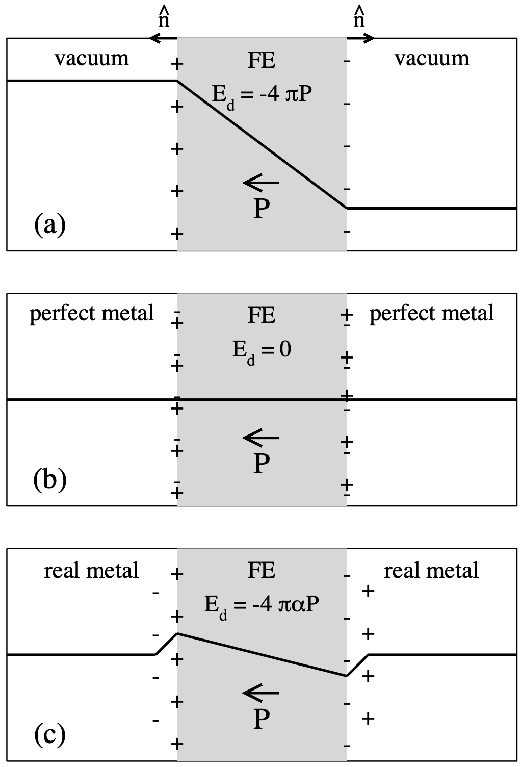 In contrast, when the polarization surface charges are perfectly screened by ideal metallic electrodes (Fig. 1b), the depolarization field vanishes: