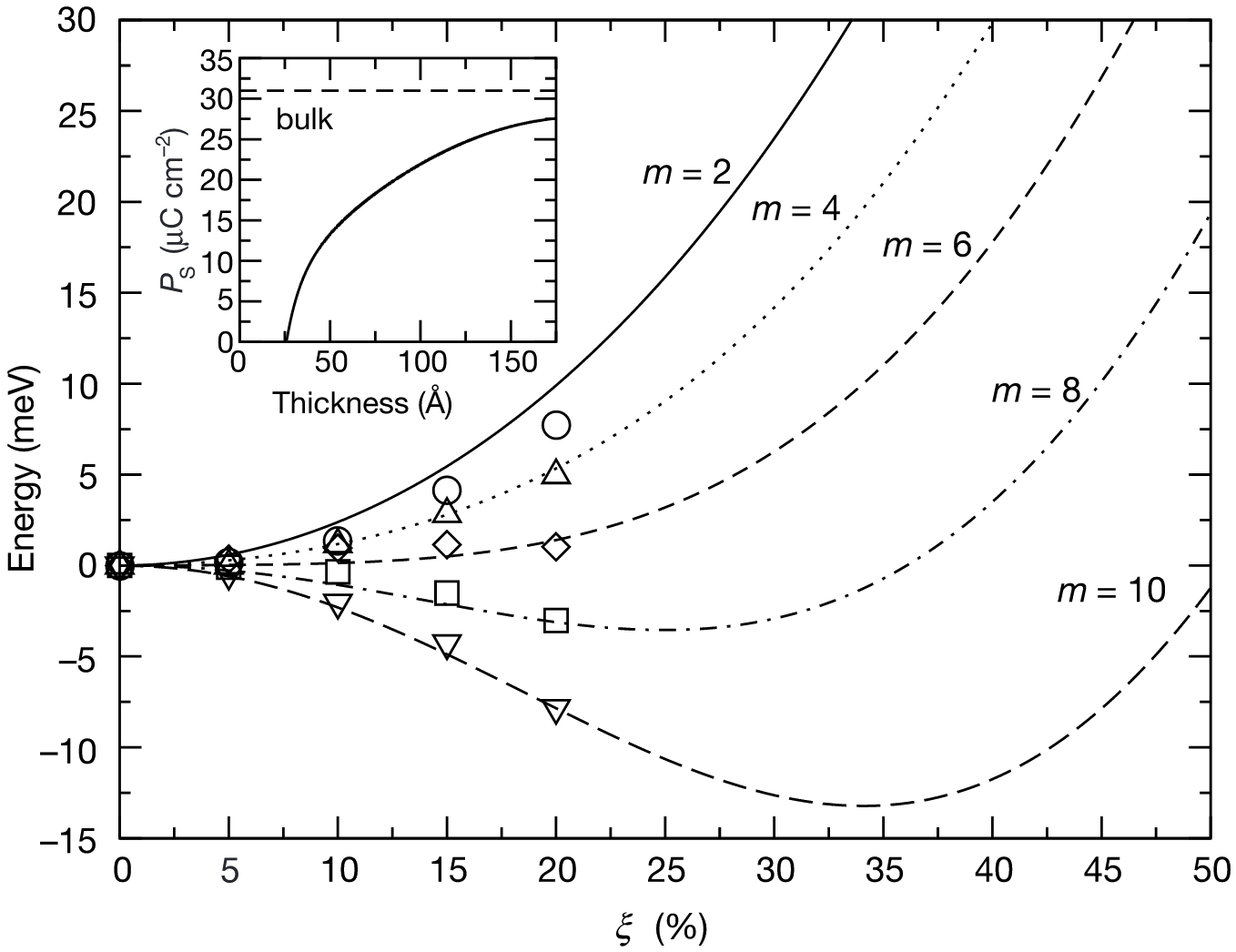 Figure 3. Evolution of the energy as a function of the ferroelectric distortion for thin films of different thicknesses ($m$, in unit cells). Inset shows the evolution of the spontaneous polarization with thickness, which dispears at a critical thickness of approximately six unit cells ($m$=6, $d$=24 Å). Extracted from Ref. [2].