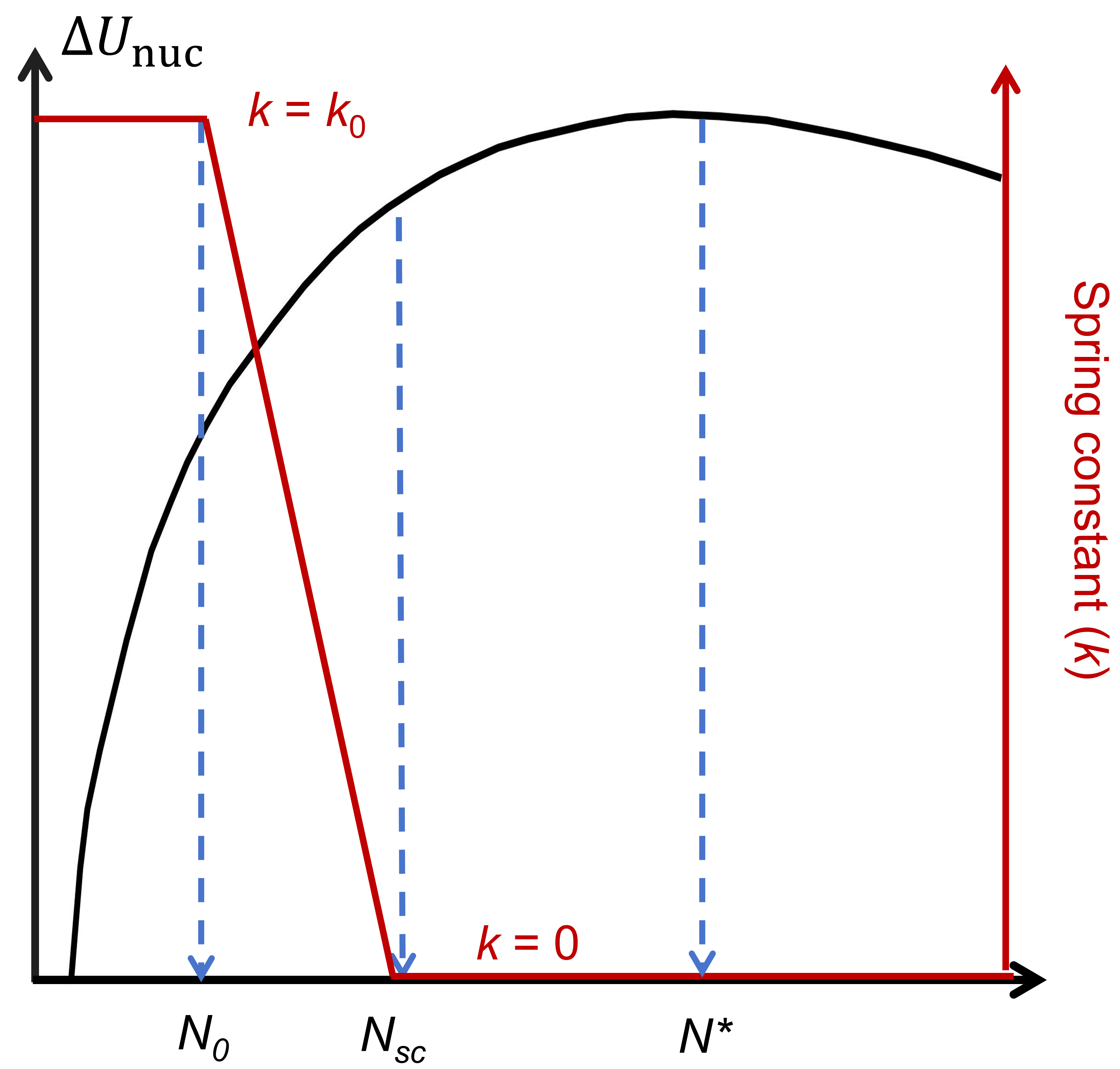 To prevent the system from reverting to its original state, an adjustable harmonic potential is applied to each oxygen atom in the embryo. This strategy effectively suppresses long-term nucleation fluctuations present in smaller nucleus. Once the nucleus size \(N\) exceeds the subcritical threshold \(N_{sc}\), the potential is gradually weakened and eventually removed. The elastic constant of the harmonic potential follows the formula \(k(N) = k_0\left[(N_{\rm sc} - N)/N \right]\) (when \(N < N_{\rm sc}\)), otherwise \(k(N) = 0\). By adaptively reducing the spring constant to zero before reaching the critical nucleus size, rPEM ensures that the system's dynamics at the critical point evolve naturally, i.e., without any bias. The observed plateau in the nucleus size evolution curve \(N(t)\) indicates the period during which the nucleus size oscillates around \(N^*\). These fluctuations allow us to determine the shape and size of the critical nucleus in an unbiased environment.